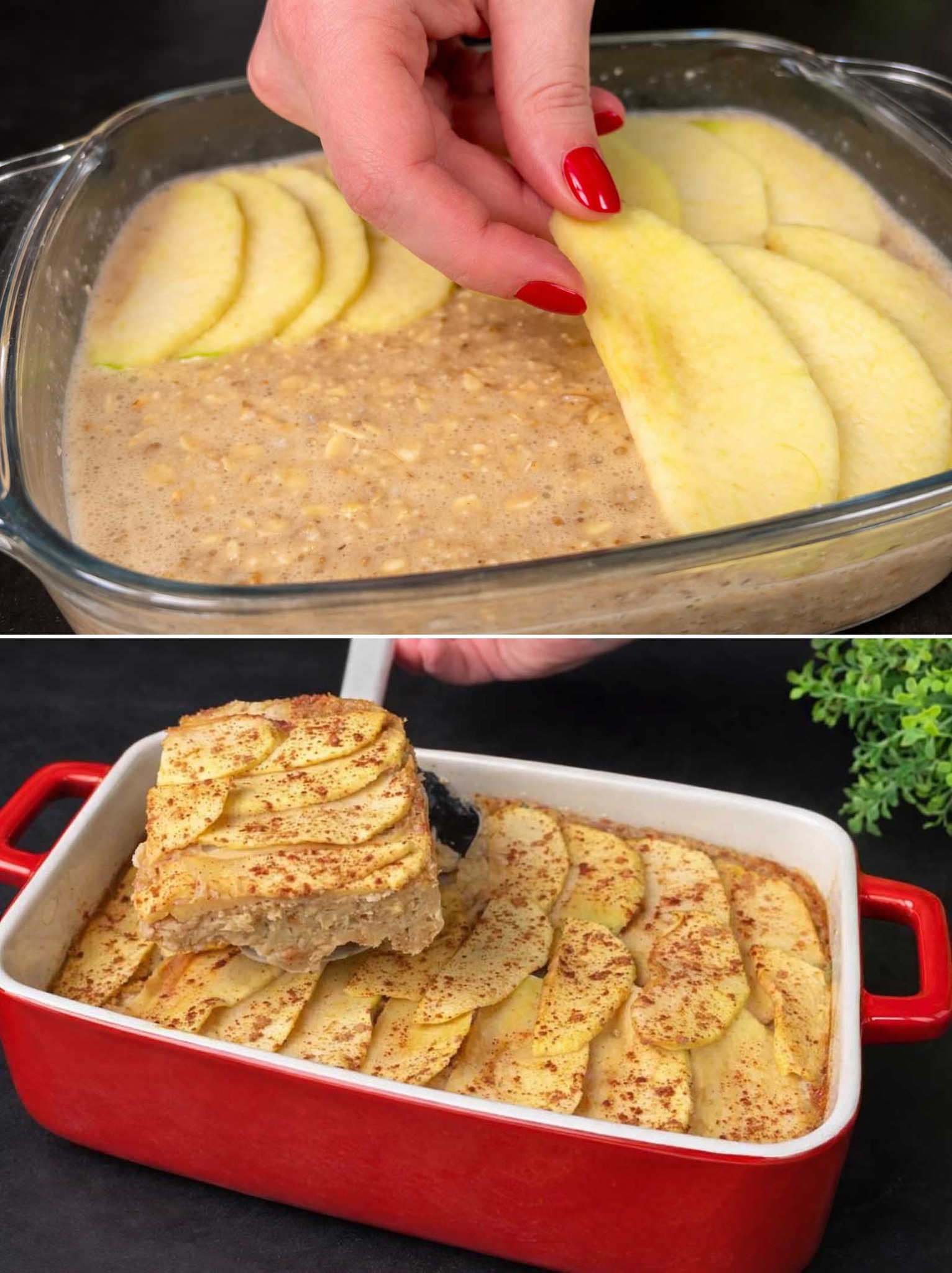 Metto i fiocchi d’avena in una pirofila rettangolare (oppure in una ciotola capiente) e verso sopra il latte.