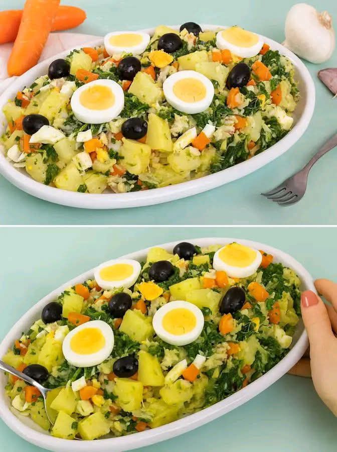 Questo piatto è una fonte ideale di proteine magre, fibra e minerali, grazie agli ingredienti come il baccalà, le patate, le carote, il cavolo riccio e le uova sode. Inoltre, la presenza di verdure come il cavolo riccio e le carote contribuisce ad apportare vitamine e antiossidanti. Le olive nere e l’aceto aggiungono un tocco di sapore che rende il piatto ancora più gustoso, mentre l’olio extravergine d’oliva dona la giusta dose di grassi sani.