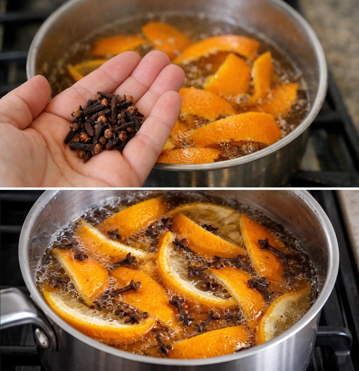 Aggiungere le bucce di arancia e i chiodi di garofano e abbassare la fiamma.