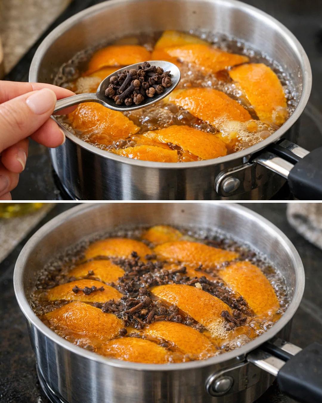 Aggiungere le bucce di arancia e i chiodi di garofano e abbassare la fiamma.