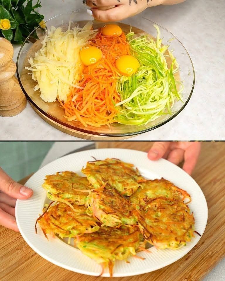 1 carota, 1 patata, 1 zucchina, 2 uova, sale q.b., 2 cucchiai di farina, olio d'oliva per friggere. Istruzioni: