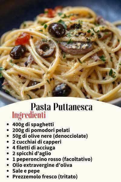 Pasta Puttanesca è uno di quei piatti che racchiude tutto il carattere della cucina del sud Italia: semplice, veloce da preparare e incredibilmente saporito. Gli ingredienti sono pochi ma ricchi di personalità: pomodori, olive nere, capperi, acciughe e aglio. Il risultato? Una pasta dal gusto intenso, salato e leggermente piccante, perfetta per una cena improvvisata ma indimenticabile.